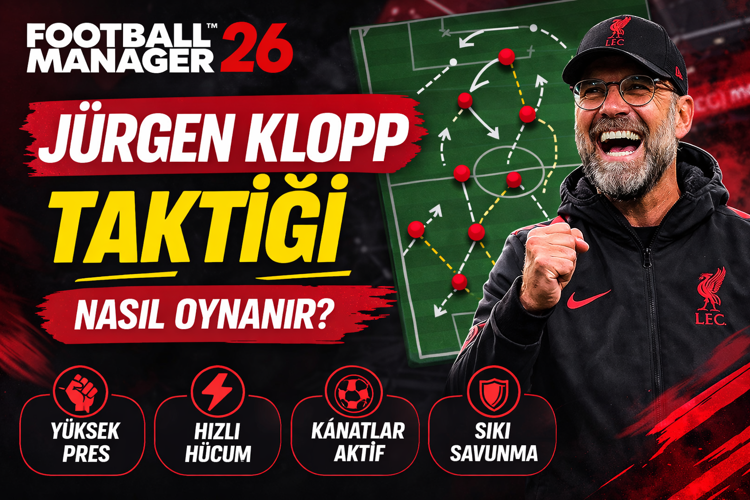 FM26 Klopp taktik rehberi: Gegenpress, hızlı hücum ve kanat kullanımıyla rakiplerinizi alt edin. Adım adım taktik kurulumu ve ipuçları burada!