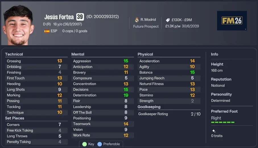 Real Madrid altyapısından çıkan genç sağ bek, FM26’da en dikkat çeken savunma yeteneklerinden biridir. Hızlı olması ve hücuma katkı sağlayabilmesi onu modern bir kanat bekine dönüştürür.
