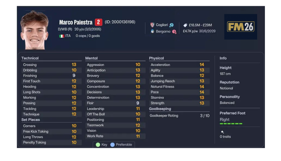Daha düşük bütçeli kariyerler için Marco Palestra oldukça iyi bir tercihtir. Atalanta altyapısından gelen oyuncu uygun maliyeti ve gelişim potansiyeliyle dikkat çeker.