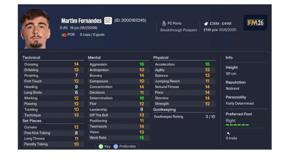 Porto altyapısından yetişen Martim Fernandes, FM26 kariyerlerinde uzun vadeli yatırım yapılabilecek sağ bek oyuncularından biridir.