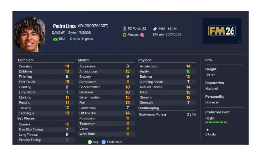 Premier League’de forma giyen Pedro Lima, FM26’da gelişim potansiyeli yüksek oyuncular arasında gösterilir. Özellikle hızlı oyun sistemlerinde oldukça etkili olabilir.