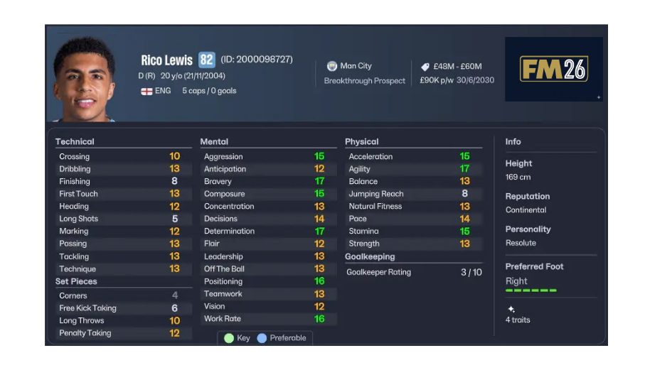 Manchester City’nin genç yıldızı Rico Lewis, Football Manager 2026’da çok yönlü savunmacılar arasında yer alır. Sağ bek pozisyonunun yanında orta sahada da görev yapabilmesi büyük avantaj sağlar.