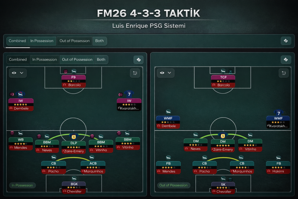 4-3-3 dizilişinde kanat oyuncuları, hücum organizasyonunun merkezinde yer alır. Luis Enrique’nin PSG’sinde bu rol oldukça dinamik ve çok yönlüdür.